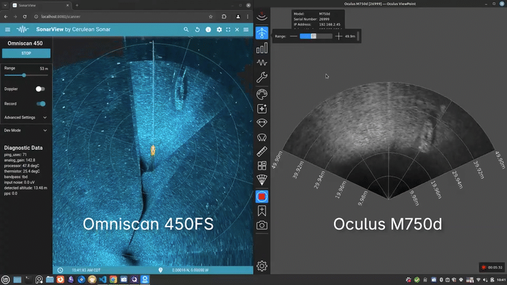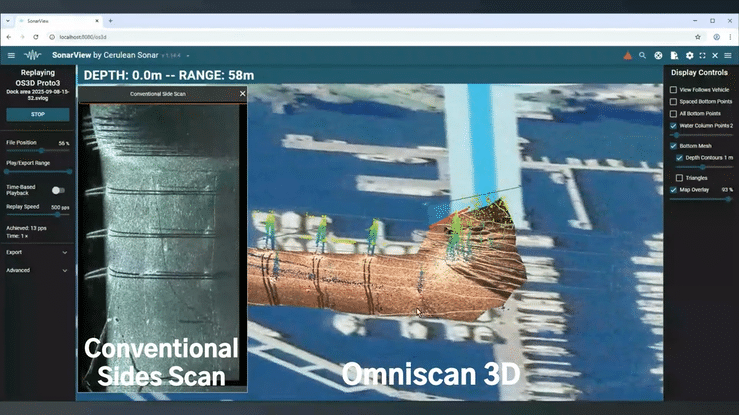 Omniscan features a single narrow and tall sonar beam in common with conventional side scan sonars. The innovation is in the tight integration with the Cerulean SonarView application which uses position and heading information and “paints” the image in real time. In a forward scanning ROV application, you have complete control of where and how you scan by rotating the ROV. This means you can instantly focus on a specific area of interest as well as maintain exquisite situational awareness with a quick 360 degree scan.